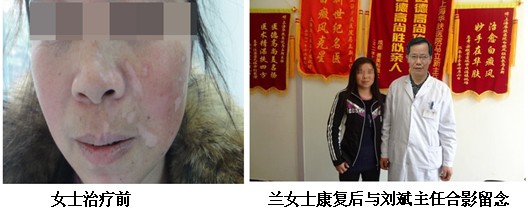 刘主任根据兰女士的病情,采用“多维白癜风康复工程”,即采用当前国际医学界最为先进的“美国308激光治疗仪”,同时配合中西药治疗,一 个月内总共通过6次光疗、二个疗程服药,取得了明显的效果:兰女士脸部的白癜风大块的缩小,小块的消失,并且都出现了黑色素生长的迹象——“黑色素岛”, 经过一段皮肤自我修复,这些黑色素岛就会全部褪去,还原健康肤色。