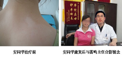 治疗仅用半个月,就收到了明显的效果。现在,安同学后颈和背部的白斑已经消失,虽然新生的皮肤有点发黑,但不久就会恢复正常肤色。安同学祛除 “心头之患”后非常开心,这个曾经的悲观女孩,说起自己的治病过程热泪盈眶,她感谢雷鸣主任让自己重新看到了人生希望,她把雷鸣比作自己的再生父母,说雷医生为她看病如同“爸爸”一样亲切和放心。在线查看☆☆☆更多白癜风康复案例☆☆☆