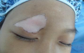 2011年8月11日复诊,患者眉前至额处的白斑明显内缩,有大量岛屿状黑色素生成。