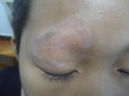 主诉:眉至前额有白斑,右大腿内侧有白斑 病症:患者患白癜风已有11年多,期间采用过口服、外用药的治疗方法,但效果不佳,后来右大腿内侧也出现白斑。患者前额处白斑的毛发已变白,近来发现白斑逐渐扩大,特来我院就诊。 检查:1、微量元素:铜离子低下 2、微循环:轻度异常 3、伍德灯:眉部至前额片状白斑的黑色素脱失70%,约10cm2、右大腿内侧黄豆大小,黑色素脱失20% 4、自体免疫系统检查:异常 诊断:局限型白癜风(发展期) 治疗:医生为患者做了详细全面的检查,在确定具体的病症情况下,根据科学的诊断结果。采用“多维白癜风康复工程”系统治疗,并配合黑色素细胞培植术治疗后,白斑处的黑色素生长良好,恢复效果明显。之后配以神疗、个性食疗等辅助治疗,患者总体恢复效果佳。治疗期间未出现任何身体不适反应,患者白斑处的皮肤已经在逐渐向正常肤色发展,患者家长对此次治疗效果非常满意。 |