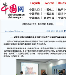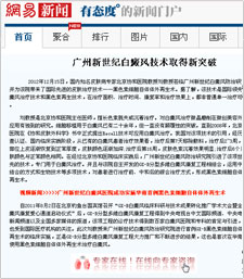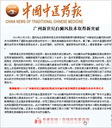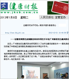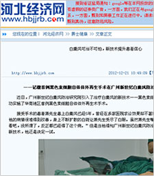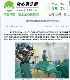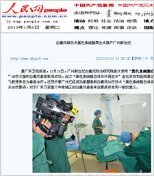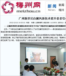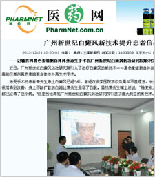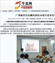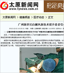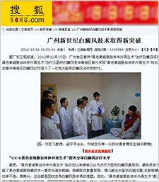 2012年12月15日,华南地区首次使用"黑色素细胞自体体外再生术"治疗大面积白癜风大获成功。此次在广州新世纪白癜风防治研究院进行的华南地区首例"黑色素细胞自体体外再生术"治疗大面积白癜风,汇聚了北京协和医院著名皮肤病专家刘志飞教授、中国白癜风协会会长孟中平、中国白癜风协会广东分会会长刘斌及广州新世纪白癜风专家等一批当前中国白癜风领军人物。"黑色素细胞自体体外再生术"首次在粤推广,便取得成功,得到了中国白癜风协会的认可,也吸引了广州电视台、广东卫视、广东电视台珠江频道等多家媒体的热切关注。